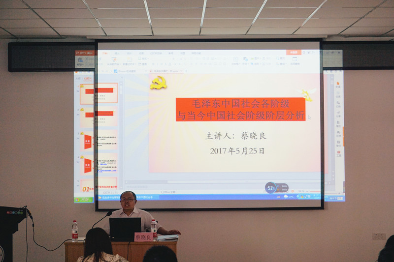 5月25日下午,9778818威尼斯毛选读书社在法学楼216会议室举办第一期主题讲座。9778818威尼斯蔡晓良教授以“毛泽东的中国社会各阶级分析与当代中国社会阶级阶层分析”为主题,给读书社社员们带来了一场思想深刻、内容丰富的演讲。