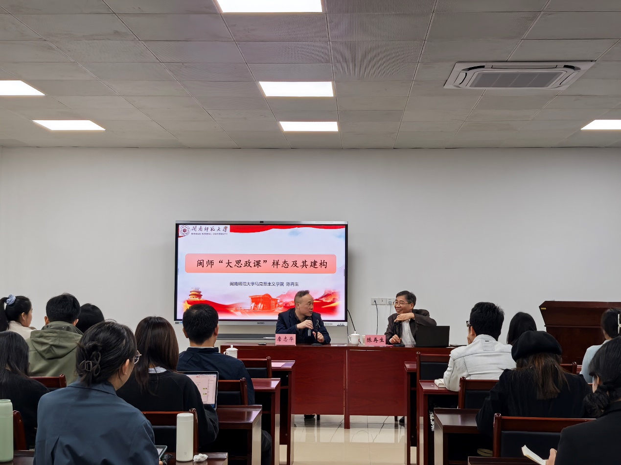 再次,陈再生教授围绕闽师“大思政课”样态的建构及收获进行了深入讲演。他分享了自己在闽师大思政课改革过程中的经验和心得,以其深厚的学术功底和丰富的实践经验,结合多个鲜活案例,为我们揭示了闽师大思政课样态建构的深刻内涵以及这种创新模式给学生和教师带来的积极变化。同时,他就如何申报教改课题、撰写相关论文等问题与参会师生进行了互动交流。