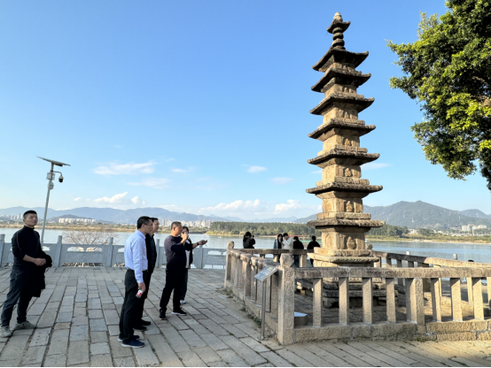 随后,实践队在村干部的带领下前往侯官水闸,依次参观镇国宝塔和螺女庙。侯官水闸前,宝塔巍巍、古庙皇皇、闽水浩浩、苍山连绵。无论是镇国宝塔高僧斩恶龙以除水患的奇幻故事,抑或是田螺仙子情意缠绵以助书生的美好传说,都体现了侯官人民勤劳、勇敢、智慧、善良、团结、友爱的杰出品质。在村干部的引导下,实践队员凭栏远眺、极目而视,在得知江畔游人如织的沙滩是闽侯县人民法院与侯官村“生态司法+文物保护”文化生态司法保护示范点后,纷纷表示侯官村以实际行动践行了“绿水青山就是金山银山”的理念。