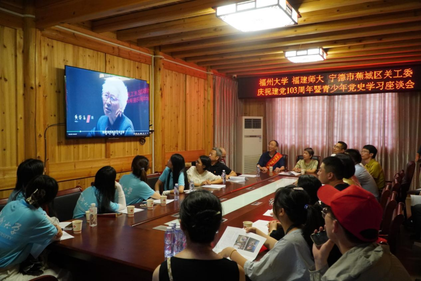 在参观结束后,队员们于展馆二楼参加庆祝建党103周年暨青少年党史学习座谈会。座谈会伊始,蕉城区关工委常务副主任郑贻雄为在场师生介绍了宁德蕉城城区的三位革命英雄人物—宁德最早中共党员、大革命时期英勇就义的郑长璋;我党我军隐蔽战线的杰出领导者,被徐向前元帅称为“无名英雄”的红军总司令部二局局长蔡威;宁德进入延安抗日军政大学第一人,在晋北抗日前线,为保护战友和村民壮烈牺牲的抗日英雄黄家祥。通过对英烈们矢志不移、坚贞不渝的革命事迹的学习,在场师生们更加深刻地感受到革命先烈们舍生忘死、英勇无畏的牺牲精神。